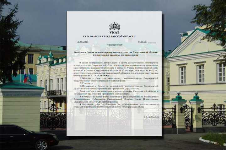 В частности, законом предусмотрено образование в области нового координационного органа в сфере осуществления мониторинга законодательства - Совета по мониторингу законодательства Свердловской области и мониторингу практики его применения. 21 января 2014 года Губернатор Свердловской области Евгений Куйвашев подписал Указ о создании Совета по мониторингу законодательства Свердловской области и мониторингу практики его применения.